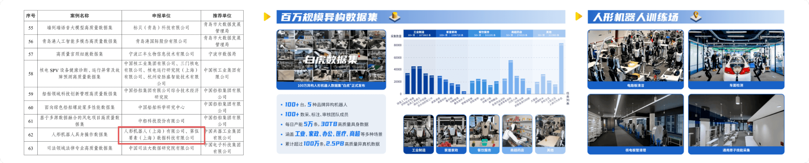 由中国兵器工业集团推荐,人形机器人(上海)有限公司联合第伍要素(上海)数据科技有限公司共同申报的 “人形机器人具身操作数据集” 成功入选国家数据局《高质量数据集典型案例名单》