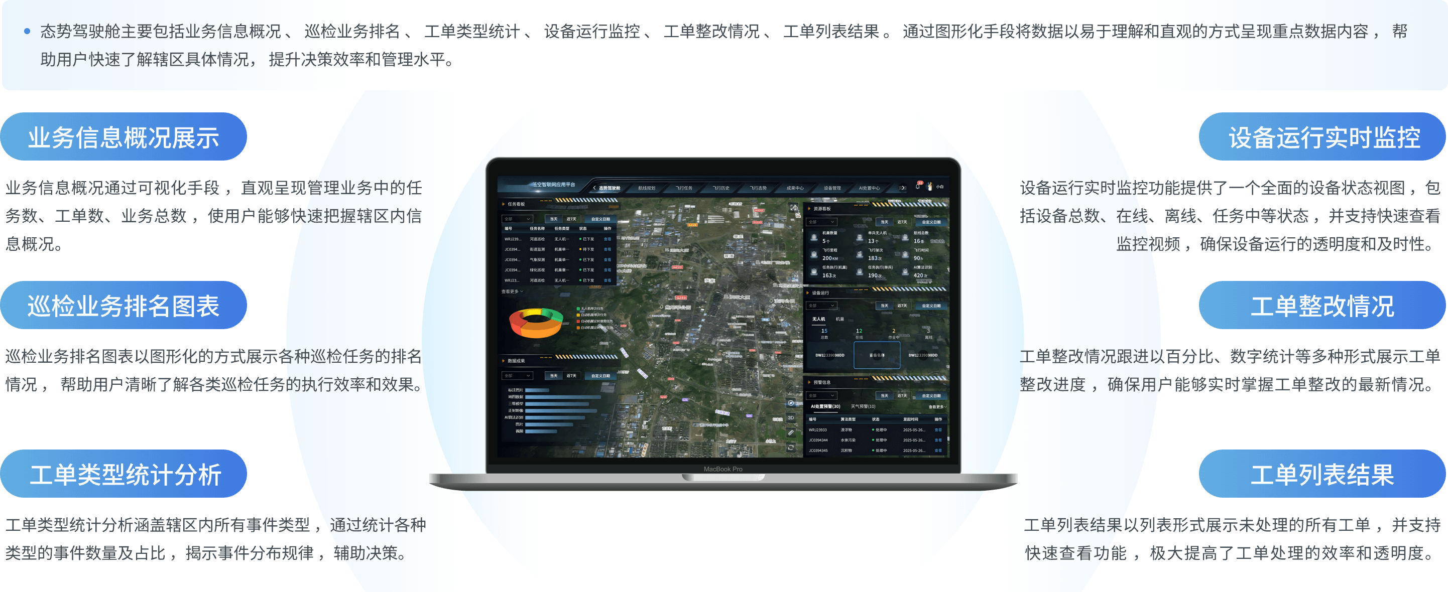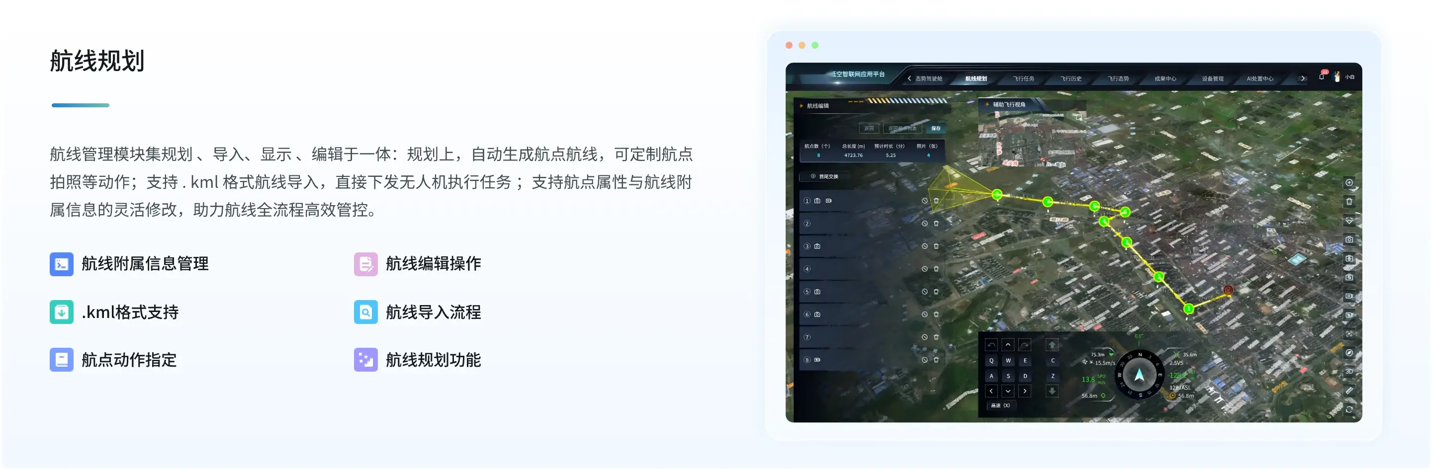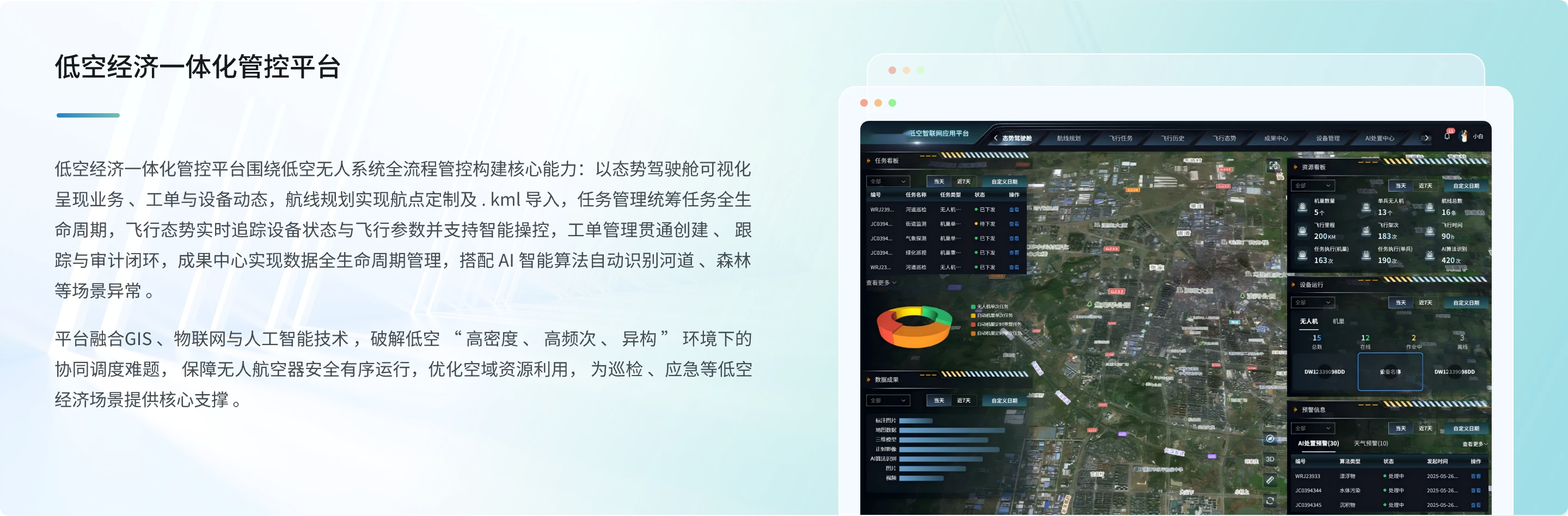 基于无人机开展自然资源巡检、生态环境巡检、电力线巡检、城市交通巡检、市政设施巡检、城市固废巡检、智慧园区巡检等场景应用,为政府精细化监管、企业精准决策提供详实的数据支持。