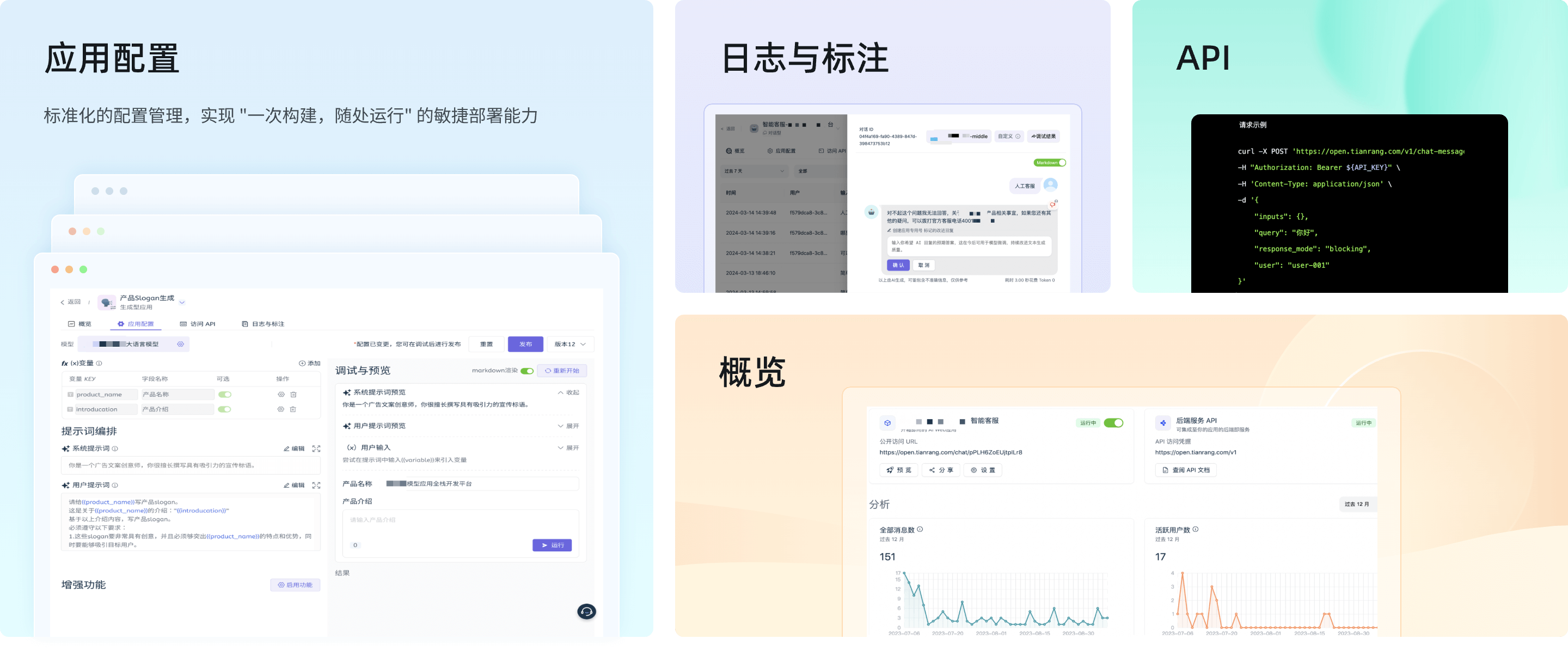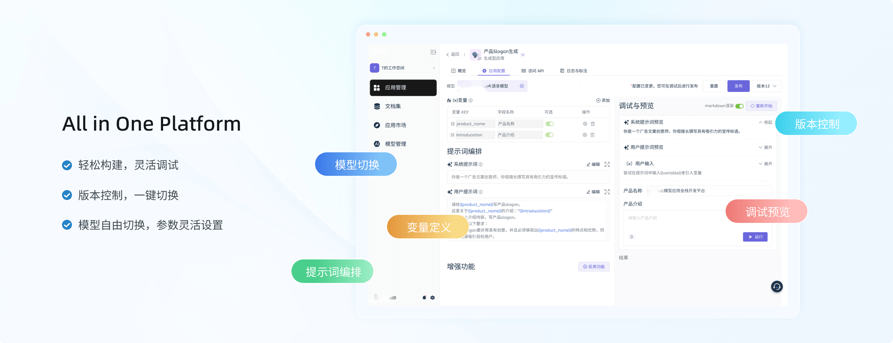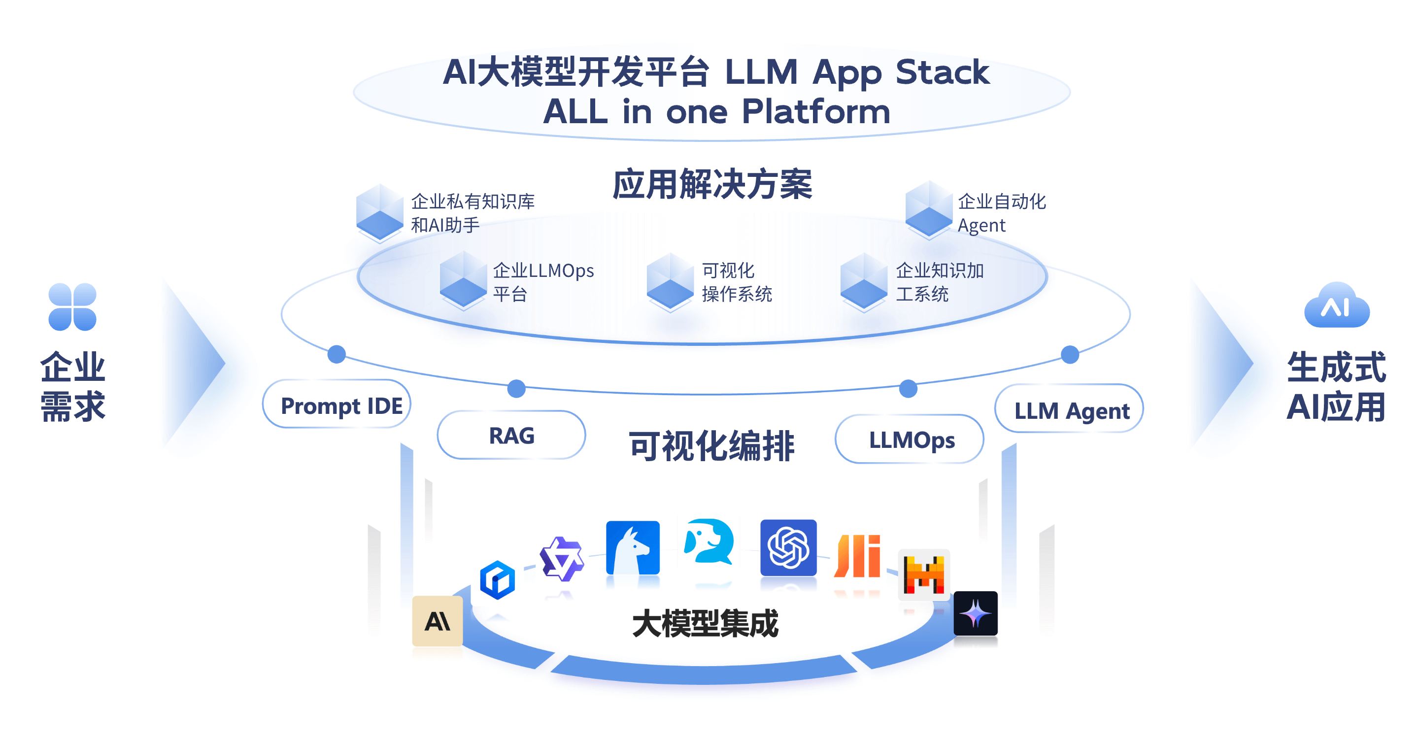 AI大模型开发平台,致力于帮助客户克服大模型应用中的准确率低、知识不专业、更新滞后等痛点。平台提供从Prompt IDE、RAG增强检索、LLM Agent编排到LLMOps运维的全链条工具,支持可视化构建对话型、生成型、搜索型和工作流四类AI应用,助力客户高效、可控地落地生成式AI能力。