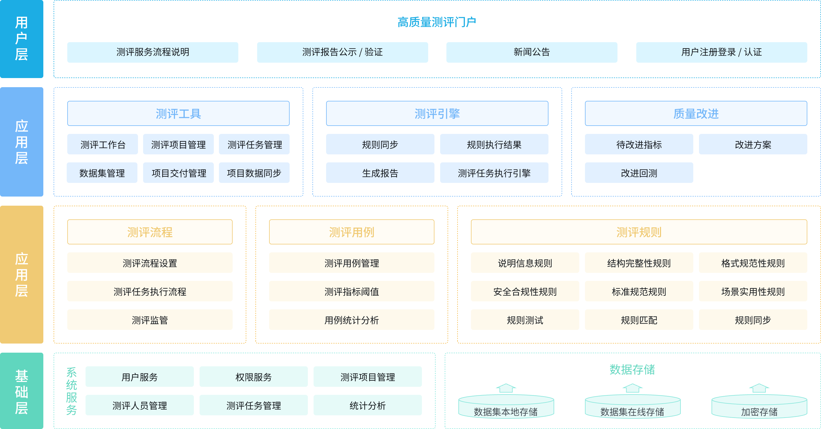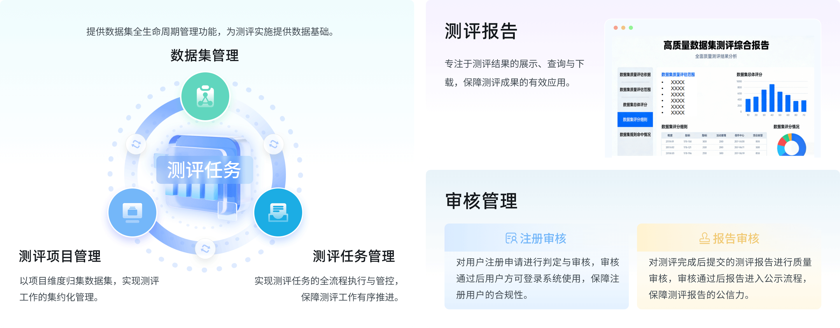 完成数据集的合规接入、多维度测评、质量改进与报告生成,输出符合政策要求和市场需求的测评结果;提供测评报告公示、验真等功能,强化数据集流通可信度,构建 "数据质量静态检测" 与"基准模型动态验证" 相结合的综合评测体系,为数据主管部门、企业、机构等用户提供标准化、低门槛、高可信的数据集测评服务。