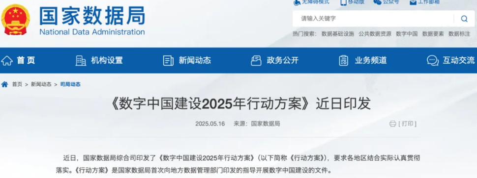 国家数据局重磅发布《数字中国建设 2025 年行动方案》,锚定数字中国建设新航向!这份意义非凡的文件,以习近平新时代中国特色社会主义思想为指引,全面加强党的领导,贯彻重要会议精神,为数字中国建设指明清晰路径。 在发展目标上,《行动方案》提出到 2025 年底,数字中国建设要取得重要进展,数字领域新质生产力壮大,数字经济核心产业增加值占国内生产总值比重超 10%,算力规模超 300EFLOPS ,政务、文化、社会等多领域数字化实现显著提升。