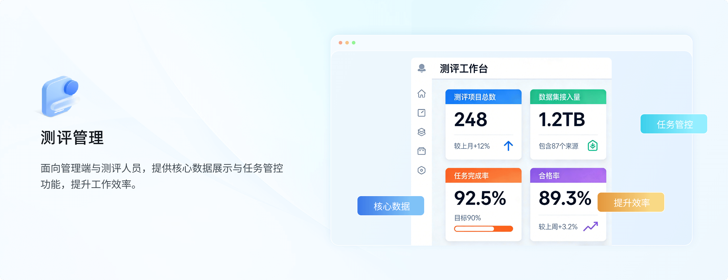 完成数据集的合规接入、多维度测评、质量改进与报告生成,输出符合政策要求和市场需求的测评结果;提供测评报告公示、验真等功能,强化数据集流通可信度,构建 "数据质量静态检测" 与"基准模型动态验证" 相结合的综合评测体系,为数据主管部门、企业、机构等用户提供标准化、低门槛、高可信的数据集测评服务。